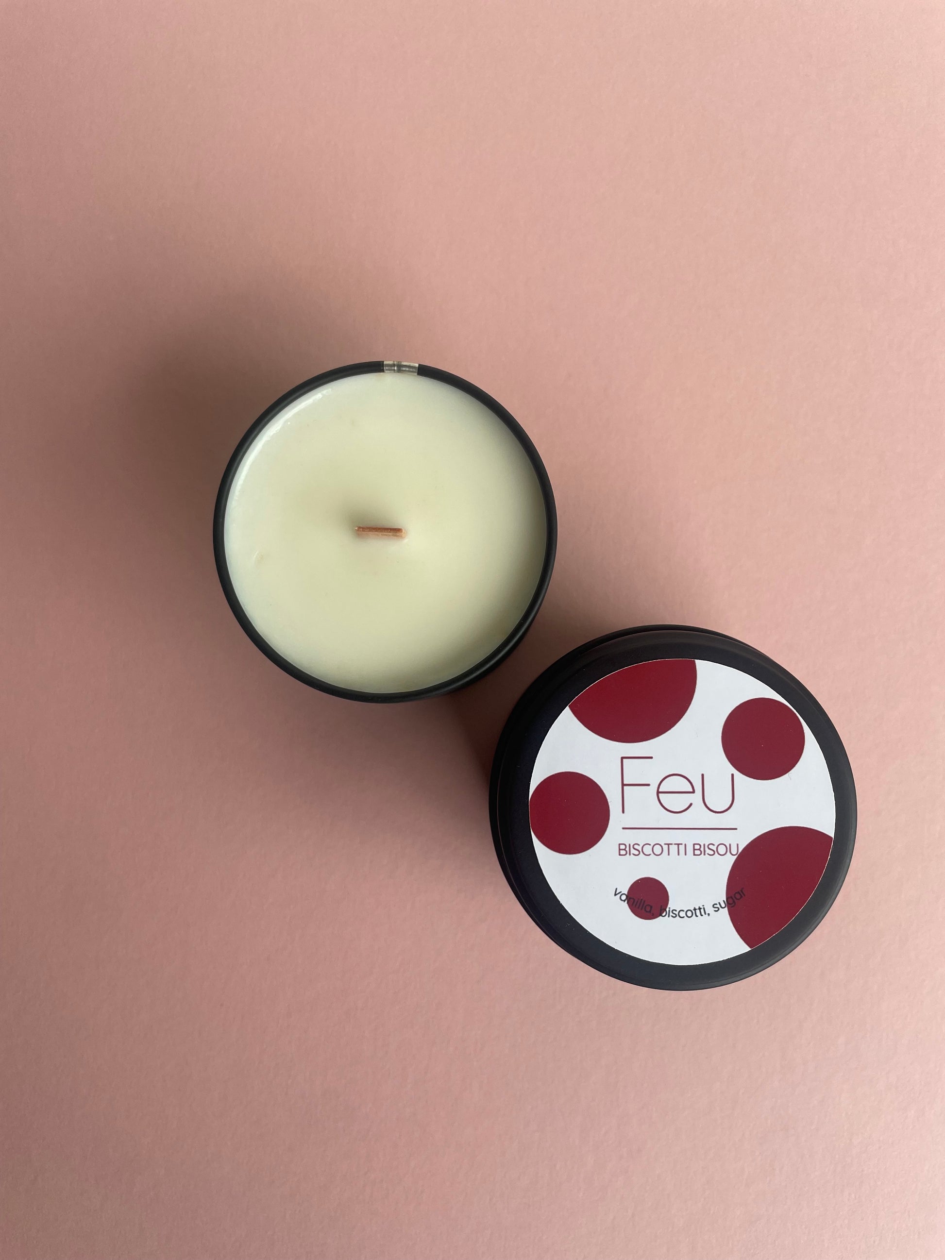 This is the new size of Feu 🕯️ these are matte black tins with lids that weigh approximately ~100g. These cuties last for 20+ hours ⏰